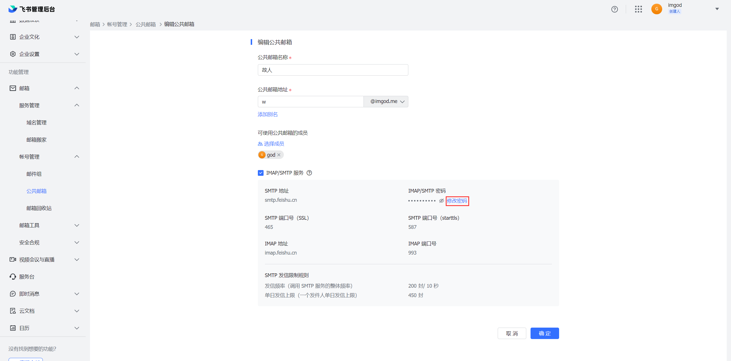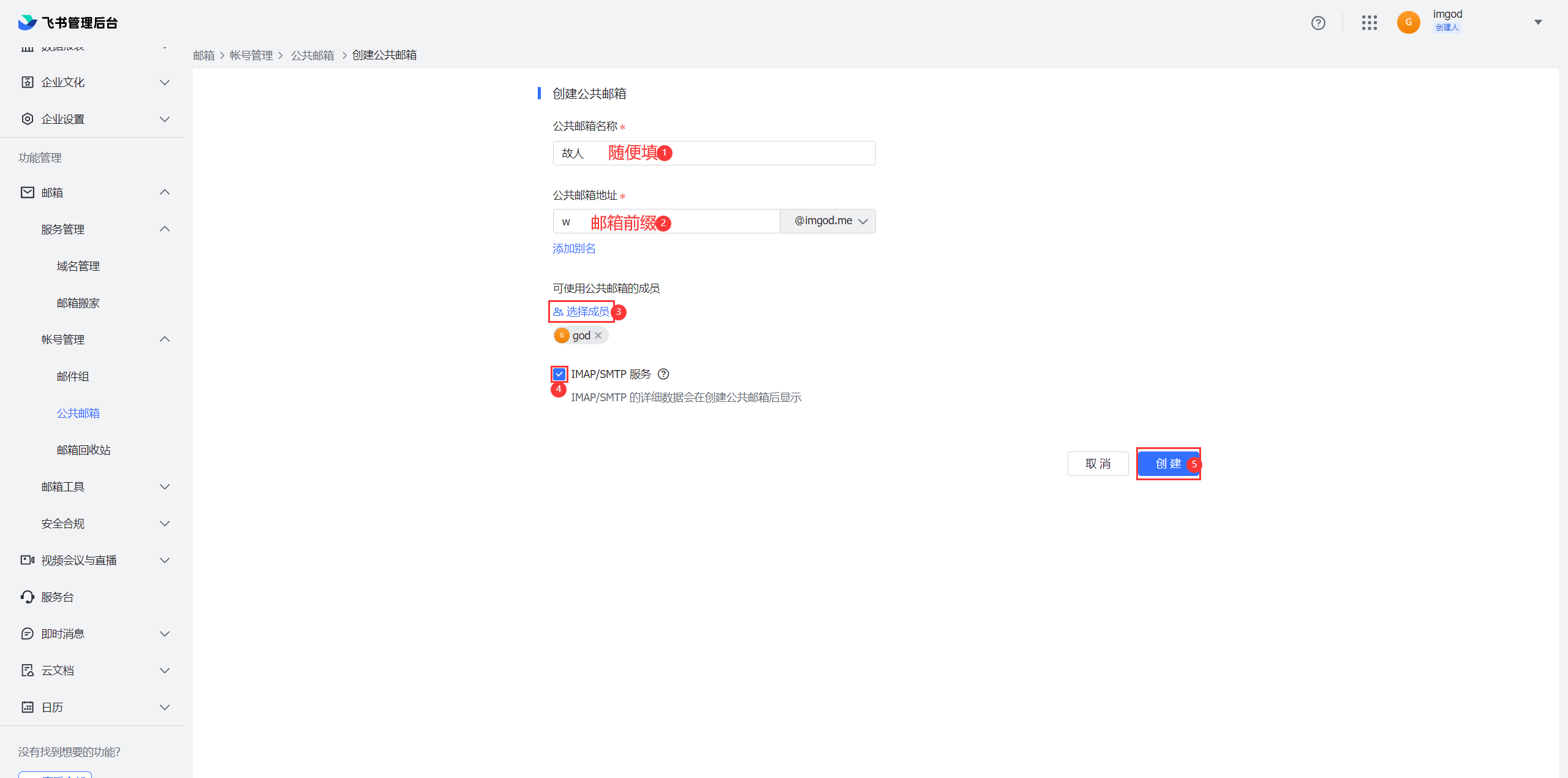 名称随意,地址需要填入前缀,成员把自己添加进去(新注册帐户的话应该只有自己),勾选 IMAP/SMTP 服务,创建