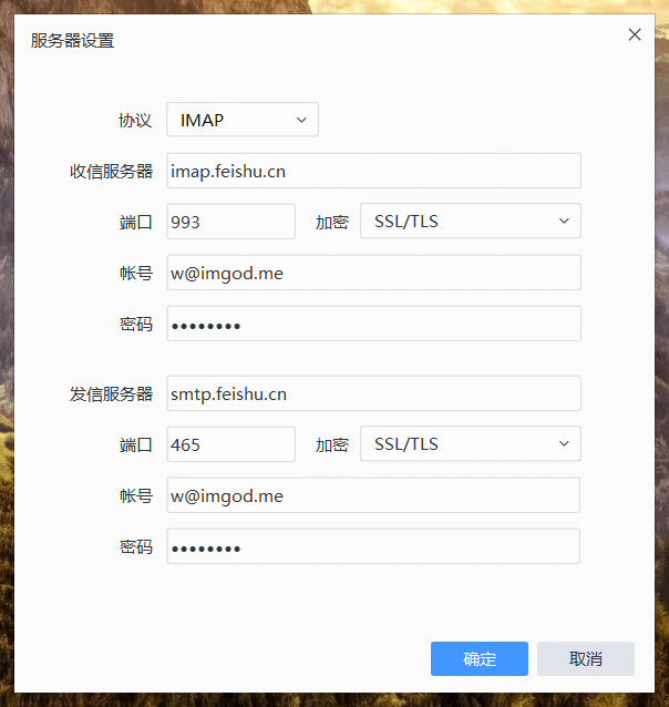 收信服务器(IMAP)地址:imap.feishu.cn,端口号:993