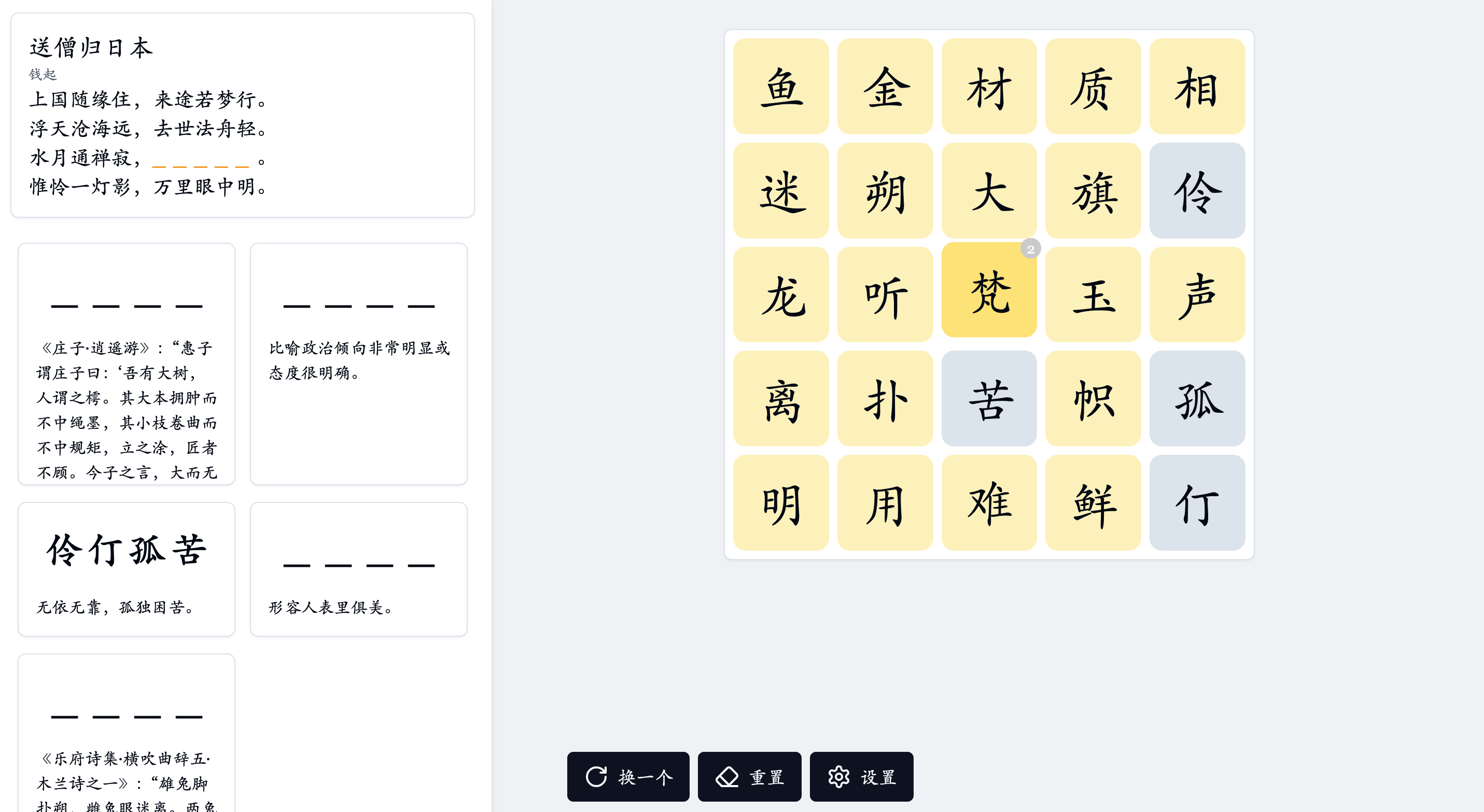 左侧是一个诗词和一些成语,右侧是一个可选择的表格,而诗词隐藏了一段,需要在右侧的表格选中缺少的句子。